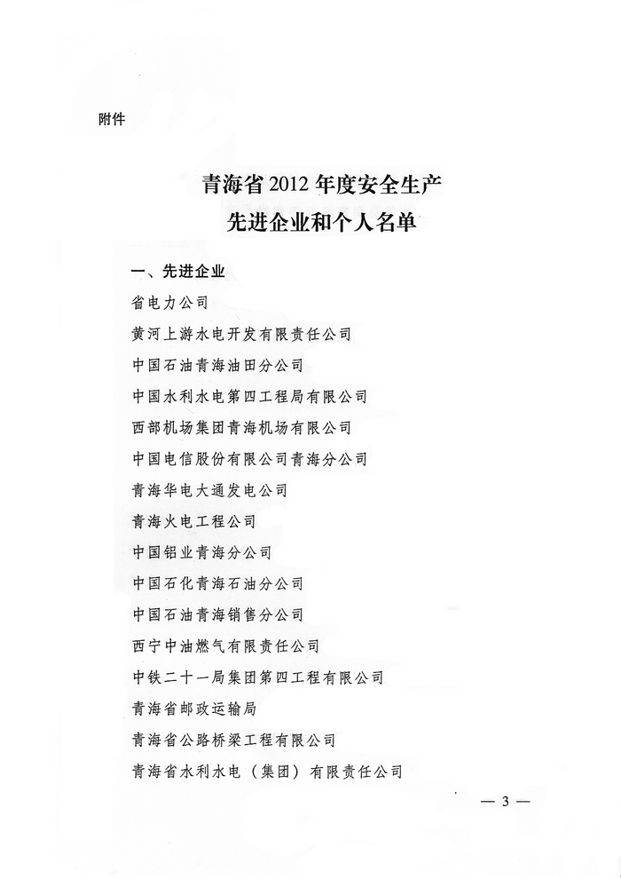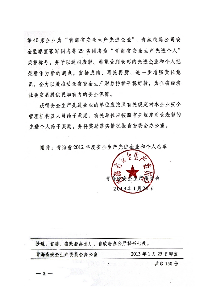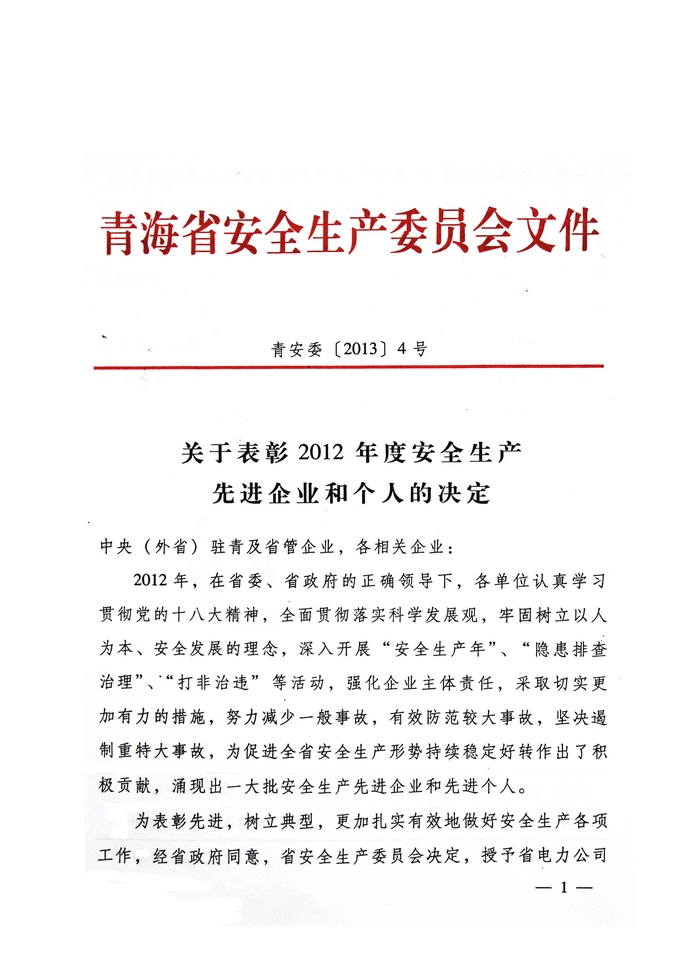 2012年,在省委、省政府的正確領(lǐng)導(dǎo)下,青海省物產(chǎn)集團(tuán)總公司認(rèn)真學(xué)習(xí)貫徹黨的十八大精神,全面貫徹落實(shí)科學(xué)發(fā)展觀,牢固樹(shù)立以人為本、安全發(fā)展的理念,深入開(kāi)展"安全生產(chǎn)年"、"隱患排查治理"、"打非治違"等活動(dòng),為促進(jìn)全省安全生產(chǎn)形勢(shì)持續(xù)穩(wěn)定好轉(zhuǎn)做出了積極貢獻(xiàn)。為此,經(jīng)省政府同意,省安全生產(chǎn)委員會(huì)決定授予青海省物產(chǎn)集團(tuán)總公司"2012年度安全生產(chǎn)先進(jìn)企業(yè)"榮譽(yù)稱(chēng)號(hào)。