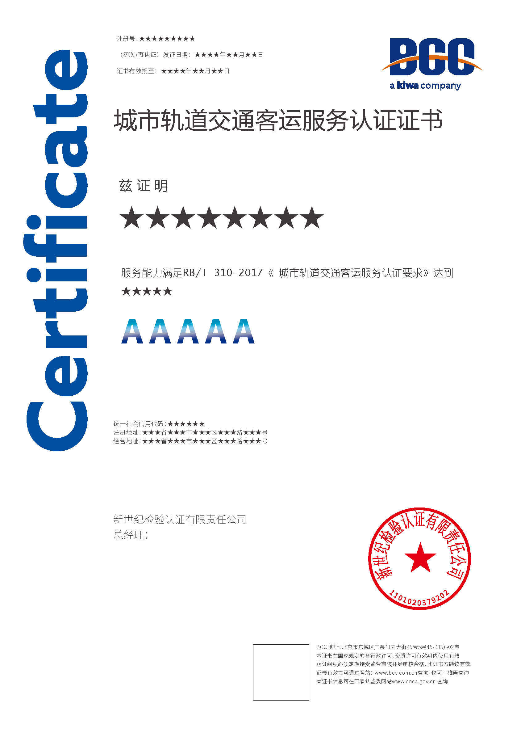 城市軌道交通,是指采用專用軌道導(dǎo)向運行的城市公共客運交通系統(tǒng),包括地鐵系統(tǒng)、輕軌系統(tǒng)、單軌系統(tǒng)、有軌電車、磁浮系統(tǒng)、自動導(dǎo)向軌道系統(tǒng)、市域快速軌道系統(tǒng)。BCC管理人員將會根據(jù)城市軌道交通客運服務(wù)的過程和能力,以及認(rèn)證周期及不同認(rèn)證階段,策劃認(rèn)證模式,通過賦權(quán)量化構(gòu)建的服務(wù)特性體驗測評表計算分值,滿分為100分。具體為:站外信息查詢服務(wù)(18分)、入站導(dǎo)乘服務(wù)(20分)、安檢服務(wù)(4.5分)、票務(wù)服務(wù)(17.5分)、乘車服務(wù)(28分)、換乘和出站導(dǎo)乘服務(wù)(12分)。服務(wù)認(rèn)證結(jié)果的排序,通常從低至高,即由A至AAAAA級,分為5個等級。