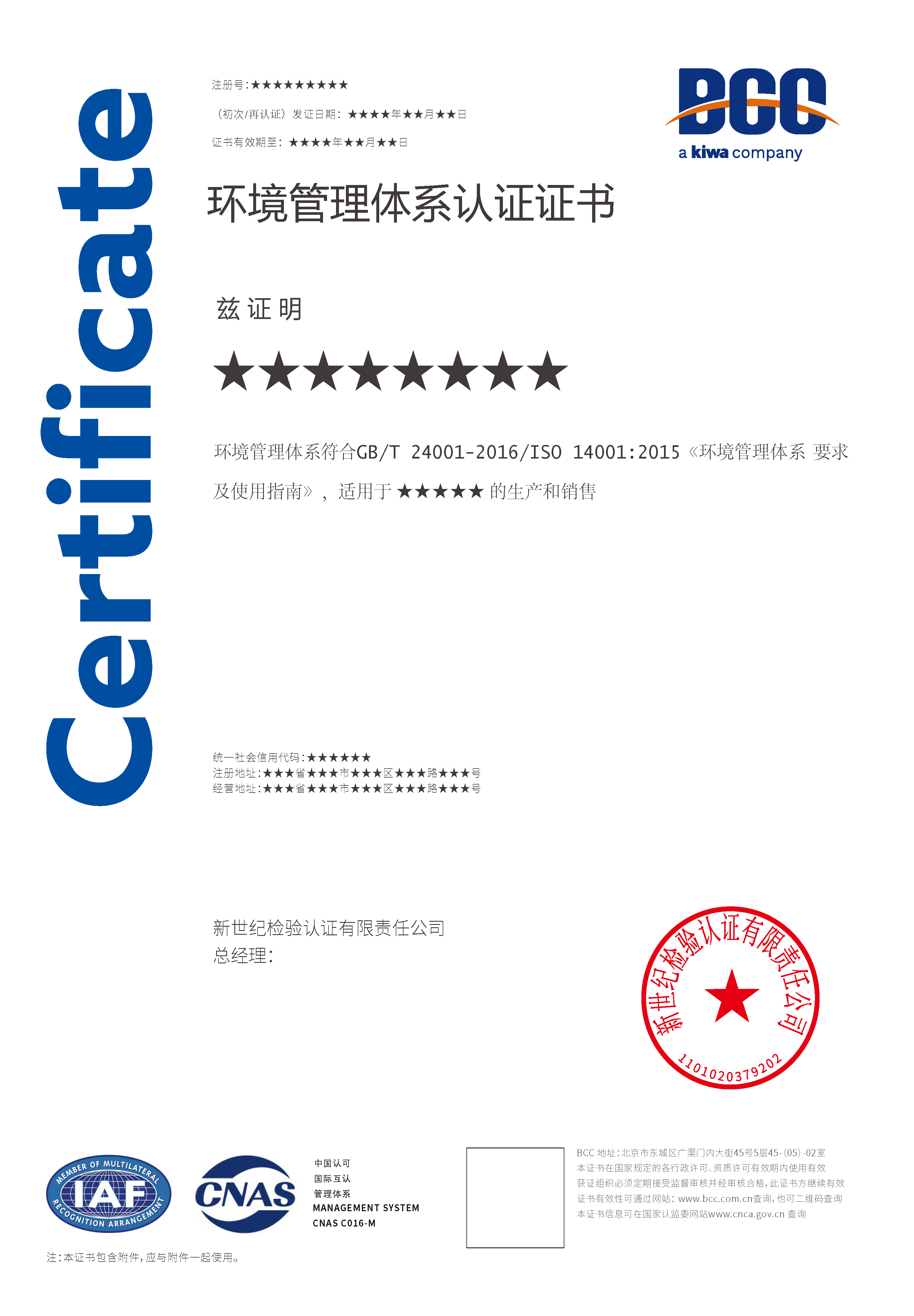 本頁涉及的認證服務中均有對應的《認證實施規(guī)則》,BCC擁有其最終解釋權。任何組織及個人未經BCC許可,不得以任何形式全部或部分使用(法律要求除外)認證相關信息。如需獲取相關實施規(guī)則請用以下方式聯(lián)系獲取:電話:010-58579316 郵箱:fwjs@kiwa.cn