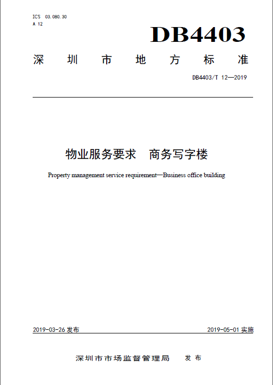 深圳市市場監(jiān)管局自2016年開始籌備物業(yè)服務(wù)認(rèn)證工作,歷經(jīng)三年多,在深圳標(biāo)準(zhǔn)認(rèn)證聯(lián)盟和標(biāo)準(zhǔn)技術(shù)研究院的大力支持下,中航物業(yè)和SGS通標(biāo)標(biāo)準(zhǔn)技術(shù)服務(wù)有限公司經(jīng)過行業(yè)走訪調(diào)研、專業(yè)論證、條款編寫、標(biāo)準(zhǔn)評審,終于在2019年5月1日聯(lián)合發(fā)布了首個服務(wù)類深圳認(rèn)證標(biāo)準(zhǔn)DB 4403/T 12—2019《物業(yè)服務(wù)要求 商務(wù)寫字樓》,標(biāo)準(zhǔn)引入了先進(jìn)的服務(wù)接觸理論和服務(wù)質(zhì)量評價模型,從客戶感知和企業(yè)自身管理兩個角度提出服務(wù)要求和管理要求,結(jié)合深圳市商務(wù)寫字樓的先進(jìn)技術(shù)和先進(jìn)方法,具有較強(qiáng)的科學(xué)性和適用性,達(dá)到了國內(nèi)領(lǐng)先、國際一流水平。認(rèn)證按照深圳標(biāo)準(zhǔn)認(rèn)證聯(lián)盟發(fā)布的首個服務(wù)認(rèn)證實施規(guī)則實施。