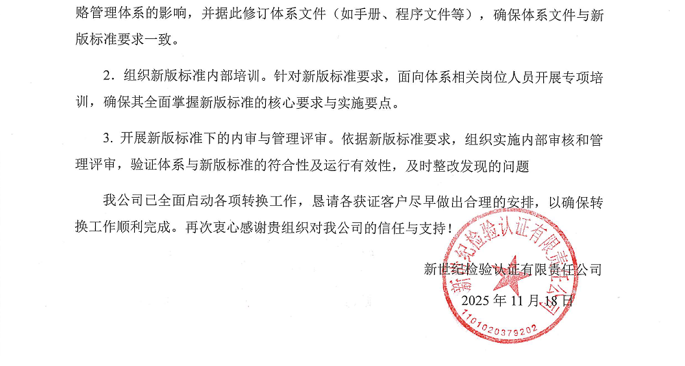2.2025年12月31日(含當(dāng)日)前,我公司仍然受理舊版標(biāo)準(zhǔn)的申請(qǐng)(包括初審、監(jiān)督和再認(rèn)證申請(qǐng))。