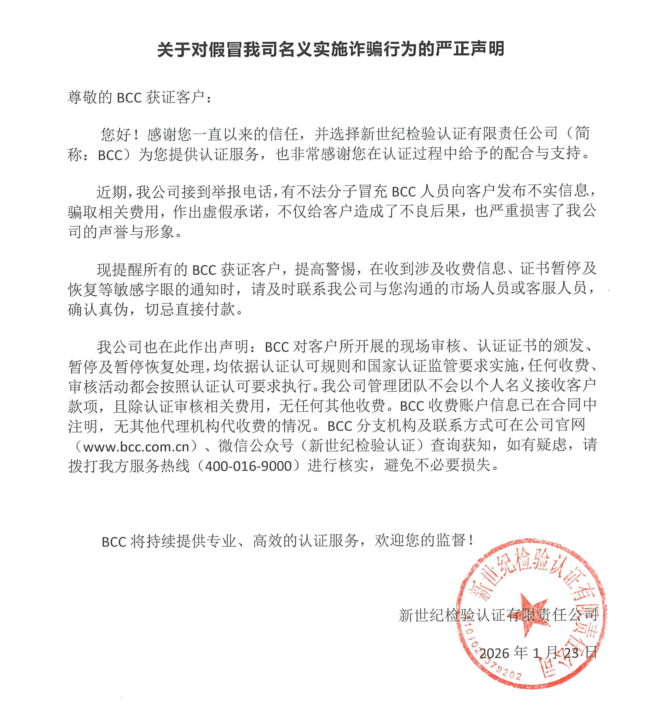 我公司也在此作出聲明:BCC對客戶所開展的現(xiàn)場審核、認(rèn)證證書的頒發(fā)、暫停及暫停恢復(fù)處理,均依據(jù)認(rèn)證認(rèn)可規(guī)則和國家認(rèn)證監(jiān)管要求實(shí)施,任何收費(fèi)、審核活動都會按照認(rèn)證認(rèn)可要求執(zhí)行。我公司管理團(tuán)隊(duì)不會以個人名義接收客戶款項(xiàng),且除認(rèn)證審核相關(guān)費(fèi)用,無任何其他收費(fèi)。BCC收費(fèi)賬戶信息已在合同中注明,無其他代理機(jī)構(gòu)代收費(fèi)的情況。BCC分支機(jī)構(gòu)及聯(lián)系方式可在公司官網(wǎng)(www.kml9zbdyj.com)、微信公眾號(新世紀(jì)檢驗(yàn)認(rèn)證)查詢獲知,如有疑慮,請撥打我方服務(wù)熱線(400-016-9000)進(jìn)行核實(shí),避免不必要損失。