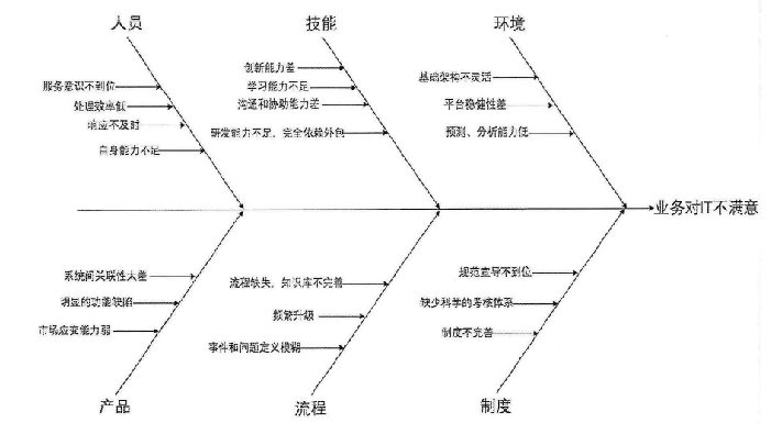 業(yè)務(wù)對IT服務(wù)不滿意的因素可以歸結(jié)在人、物、軟能力、外部環(huán)境、流程和規(guī)則制度六個方面。在對各種影響因素進行分析后,進一步尋找服務(wù)不滿的真正原因,繪制出魚骨圖。