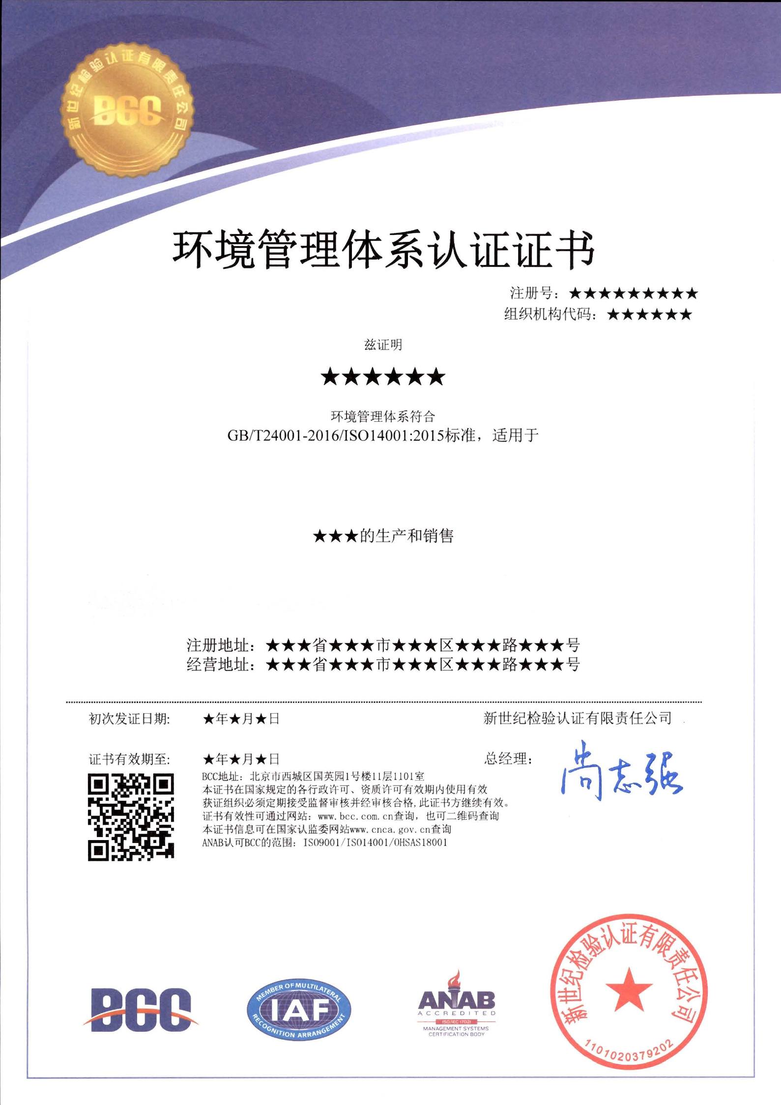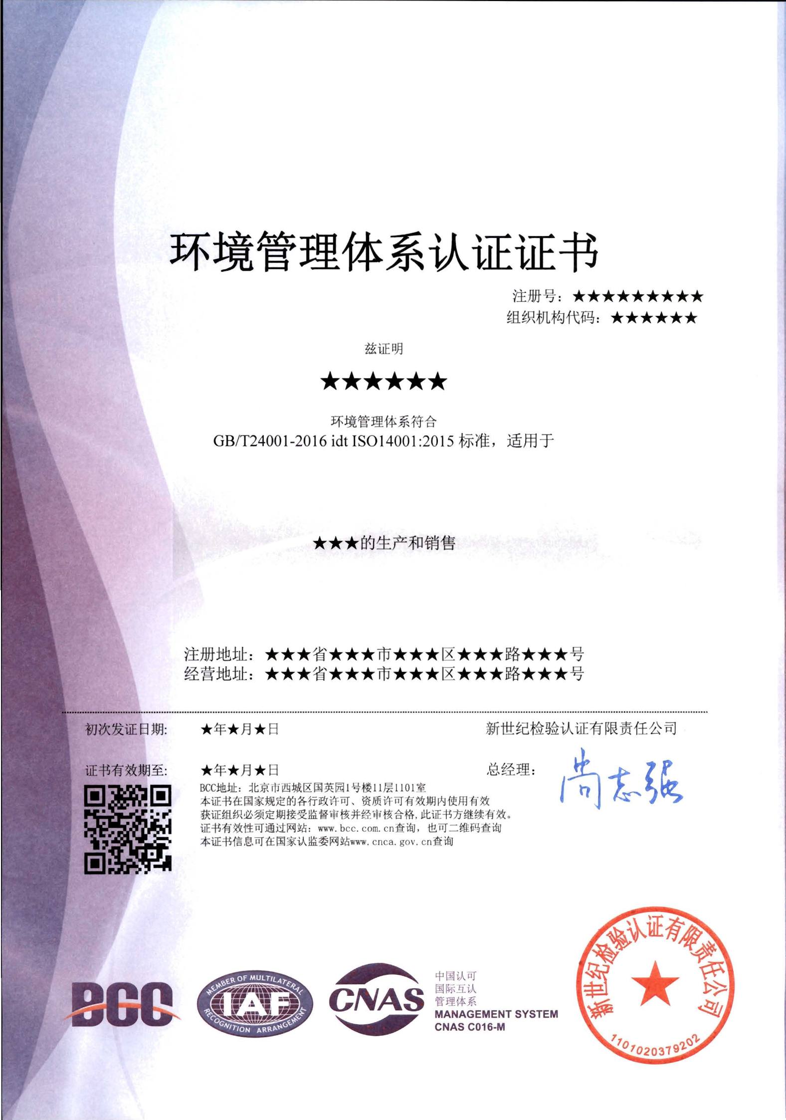 你好,環(huán)境管理體系認(rèn)證書樣本每個認(rèn)證機(jī)構(gòu)都是不一樣的。但是證書上一定有認(rèn)證的標(biāo)準(zhǔn)、標(biāo)志、產(chǎn)品范圍等信息。